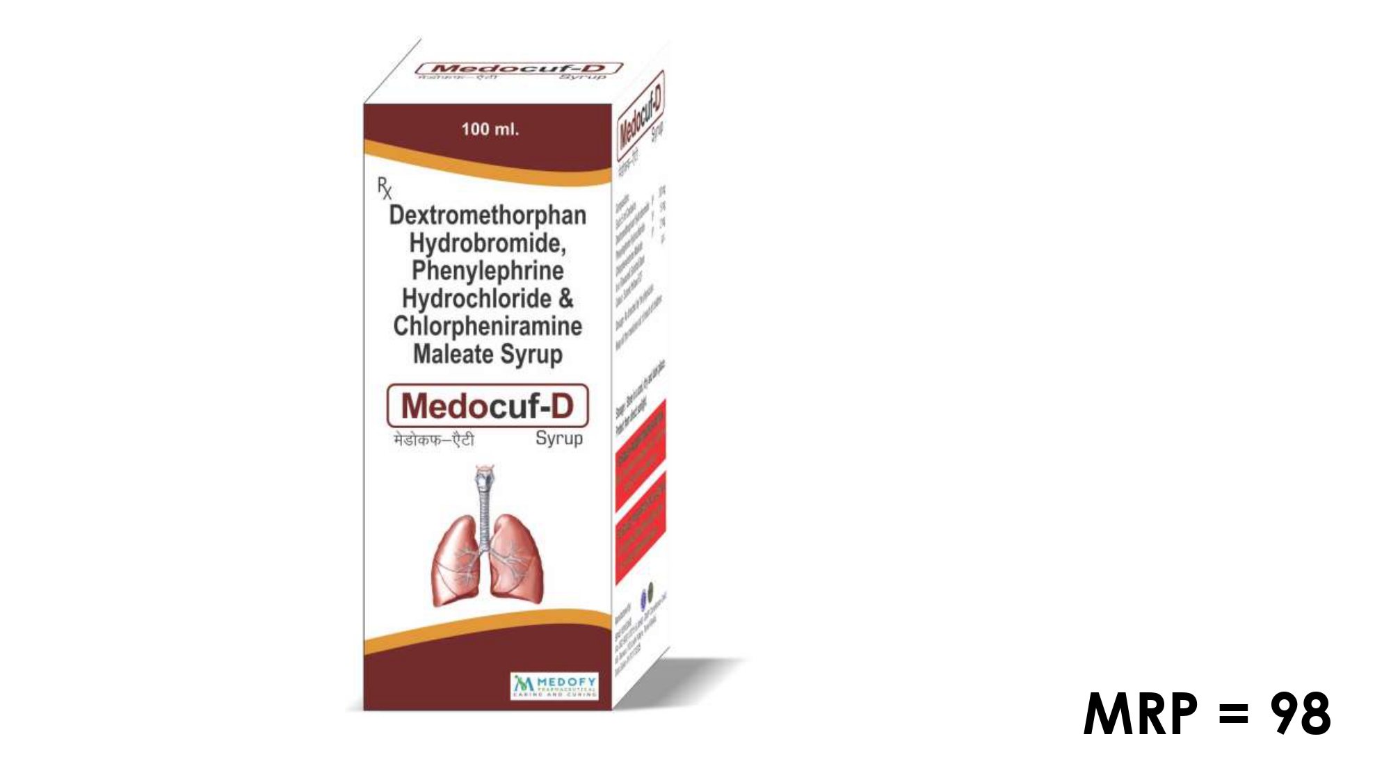 Dextromethorphan HBr.10 mg +Phenylephrine HCL 5mg + Chlorpheniramine 2mg. Syrup with cartoon pack