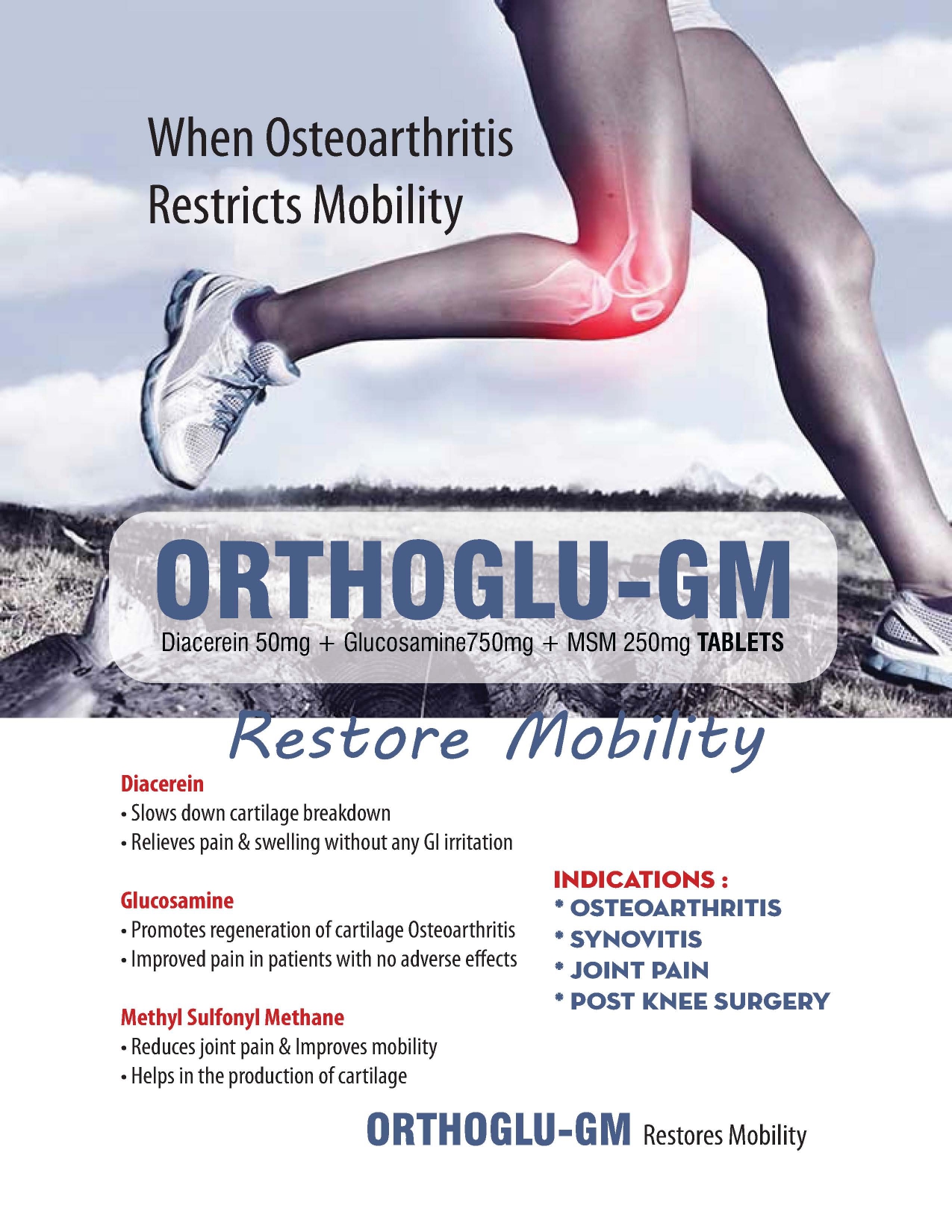 Diacerein 50mg+ Glucosamine750mg+MSM 250mg Tablet